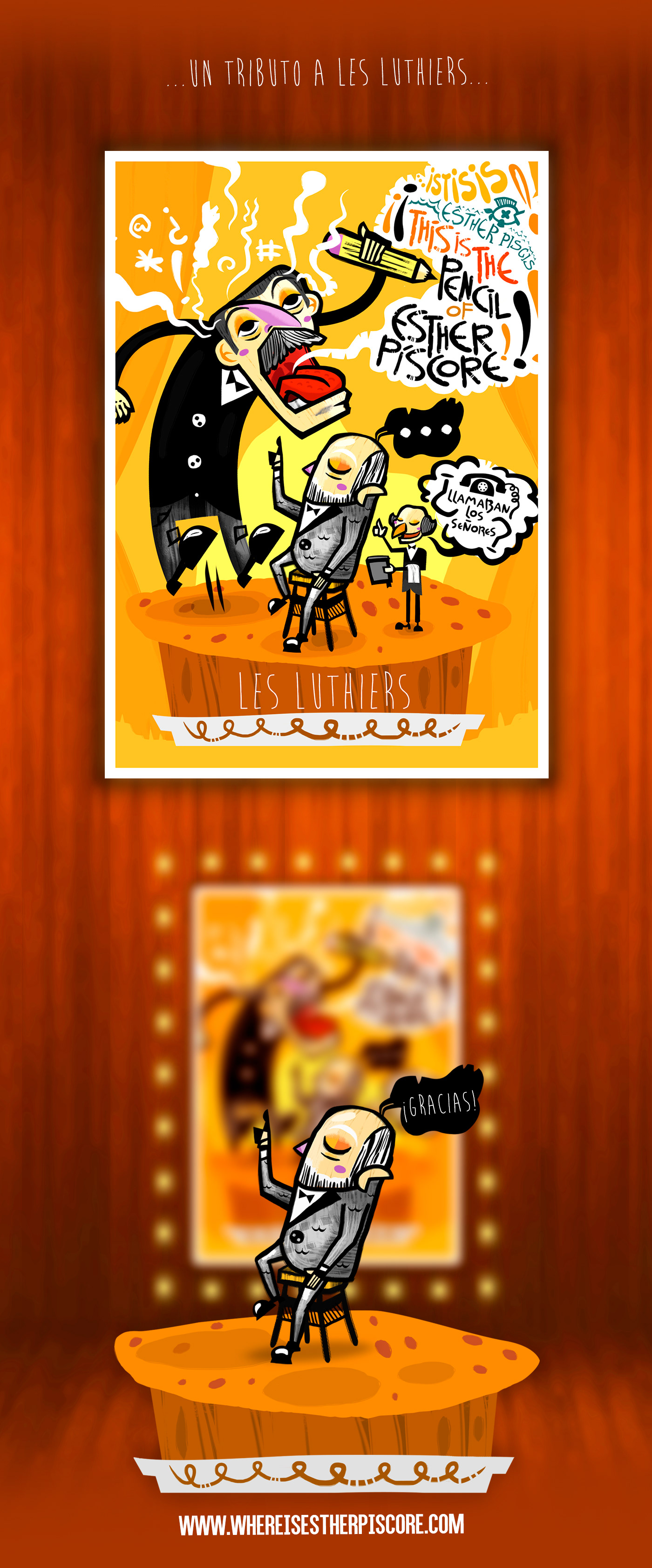 "¿Where is Esther Píscore? Just now." es un tributo ilustrado a Les luthiers. Fui seleccionado en la convocatoria con esta ilustración, espero les guste :) Sitio web del tributo: http://www.whereisestherpiscore.com/